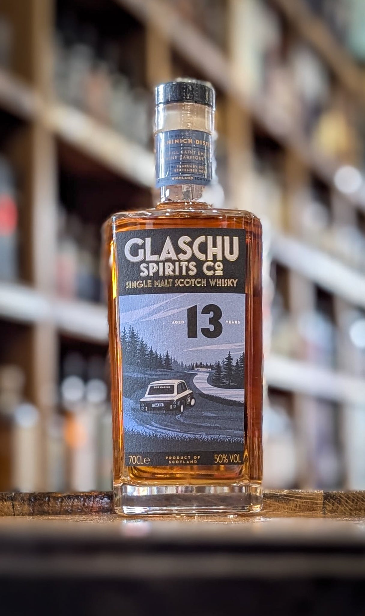 The label artwork features the iconic Hillman Imp. A rally-spec'd, Scottish-built car from the 1960's, seen drifting round a dirt track adjacent to the river Alness, at Teaninich Distillery.